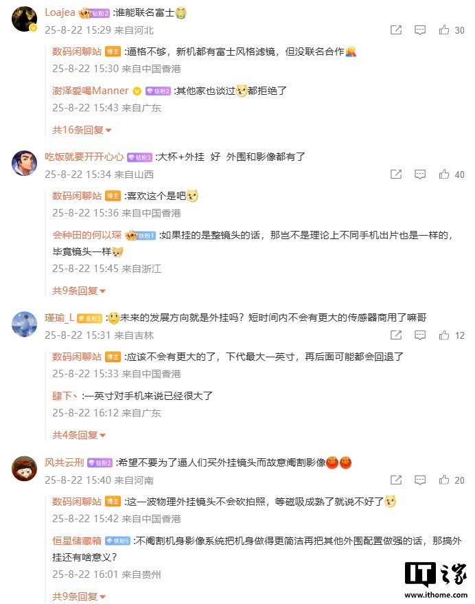 博主还在评论区回复了部分网友的问题:针对是否有厂商会联名富士,他表示“逼格不够,新机都有富士风格滤镜,但没联名合作”;针对未来新机短时间内是否不会有更大的传感器商用,他回复称“应该不会有更大的了,下代最大一英寸,再后面可能都会回退了”。